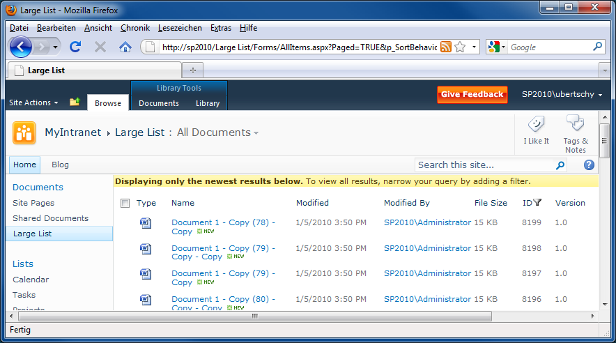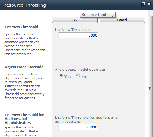 Um die Problematik mit grossen Datenmengen zu entschärfen, wird das sogenannte List Throttling eingeführt, über das man nun die Kontrolle über die Menge an Datensätze erhält, die ein Benutzer abrufen kann. Bei Listen mit Tausenden von Einträgen kann der Administrator nun verhindern, dass Anfragen ausgeführt werden, bei denen ein bestimmtes Limit an angeforderten Items (Default-Einstellung: 5000 Items) überschritten wird. Solche Anfragen würden den Server nur unnötig belasten und die Benutzer wegen der langen Wartezeiten verärgern. Stattdessen erhält der Benutzer einen freundlichen Hinweis, dass wegen Überschreiten des Throttling-Richtwerts nur die neuesten Datensätze zurückgegeben wurden und er es mit einer gefilterten Abfrage (z.B. über die neue Metadata-Navigation) versuchen soll.